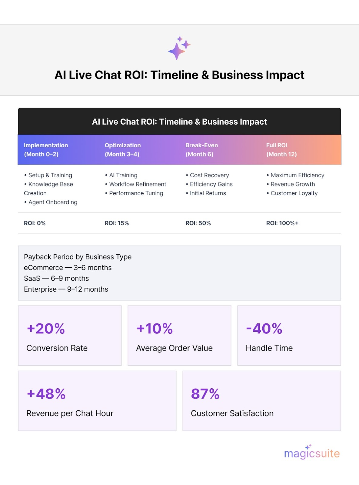 Implementing AI-powered live chat software delivers a significant, measurable return on investment (ROI) across key business metrics. Our research indicates that the benefits extend beyond cost savings to include revenue growth, improved customer satisfaction, and enhanced operational efficiency.